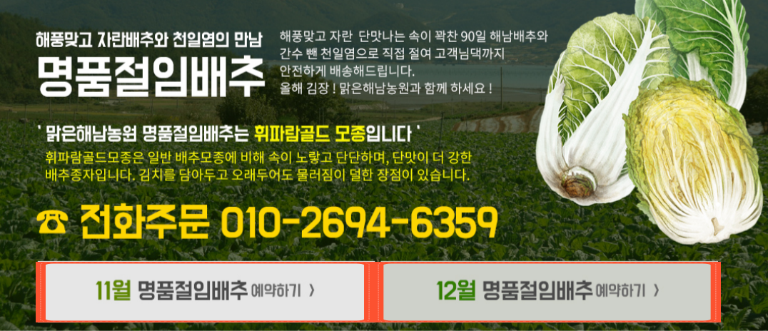 ■ 구매 시기: 해남 절임배추는 일반적으로 11월 초부터 출하가 시작되며, 김장철인 11월 중순부터 1월 말까지 구매하실 수 있습니다.